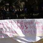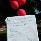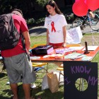 Dildos were propped up on tables like soldiers at attention, waiting for their Durex helmets to be put on. A “Sex Spinner” sat on a table while Sex and Relationship interns asked questions and gave out t-shirts as prizes. At the center of the perimeter of tables and people was a six-foot, papered board, where people wrote responses to: “How does AIDS effect your life?”