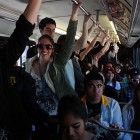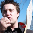 Police officers cleared the way for the march, placing a motorcade between the marchers and oncoming traffic. In their wake the protestors formed behind the line of their banners, massing together on the street and overflowing onto the sidewalks. The crowd screamed for those off to the side watching the protest to stop filming with their camera phones and join the march. Some actually did. One older woman simply plugged her ears and waited for the noisy group to pass.