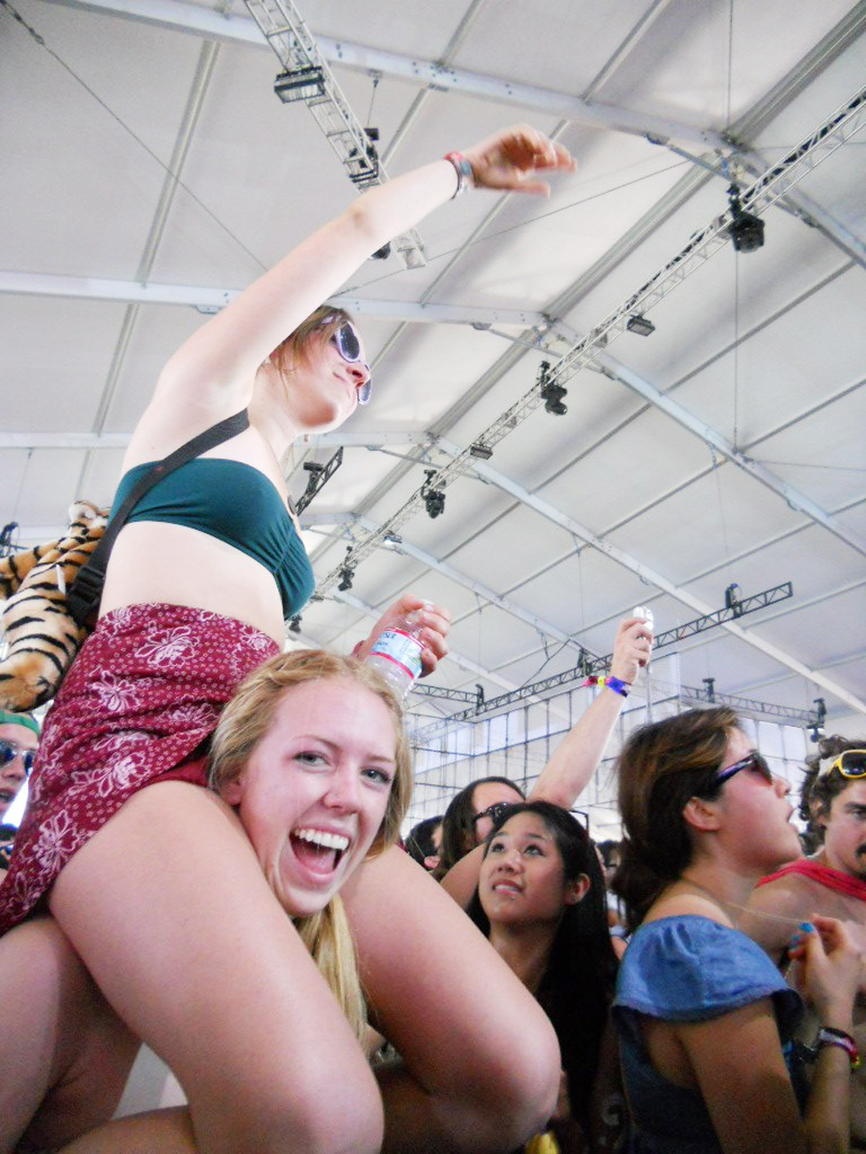To congregate with another three cars’ worth of UCSBers, I found myself at the Sahara tent for Skrillex. I knew it was time to leave when Korn joined him on stage. The daisies in my hair didn’t fit the scene where Coachella ravers flocked, but I felt right at home at my next stop: the Mojave tent for Brit pop band and 2010 South by Southwest showcasing artist, The Drums. The crowd was pure smiles singing along to the ultimate feel-good songs “I Felt Stupid” and “Let’s Go Surfing.” I felt incredibly satisfied as the set closed and made way to the main stage ten minutes late for Cee Lo Green, the artist whose awesome 2010 Grammy collaboration with Gwynth Paltrow set high expectations for a wild costume and “F*ck you Too” rendition. Unfortunately, Cee Lo was also tardy and after thirty minutes passed with no sign of the artist, I retired from my spot on the grass for a quick dash back to camp before the long night ahead.