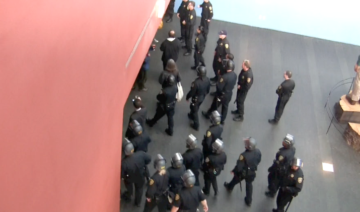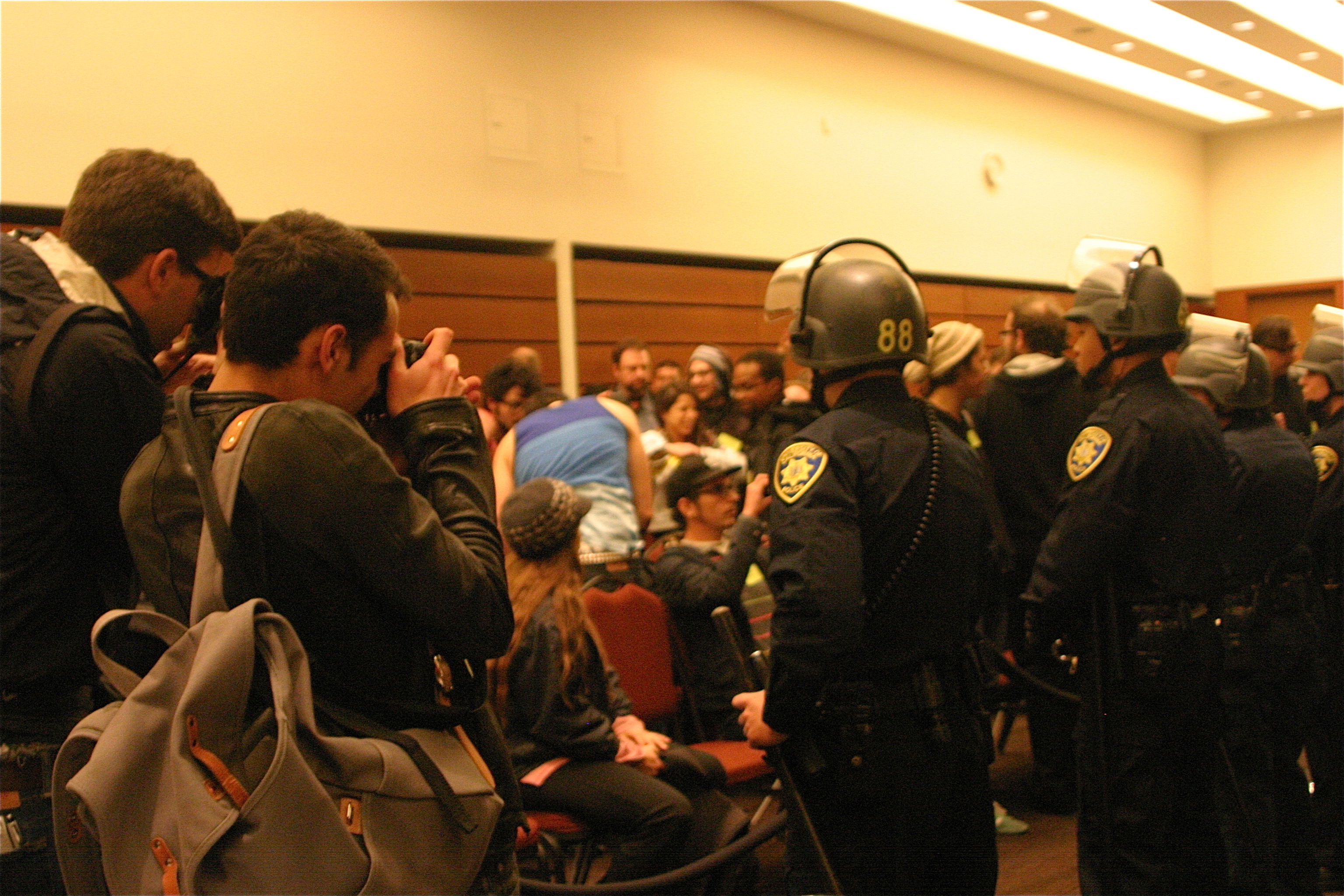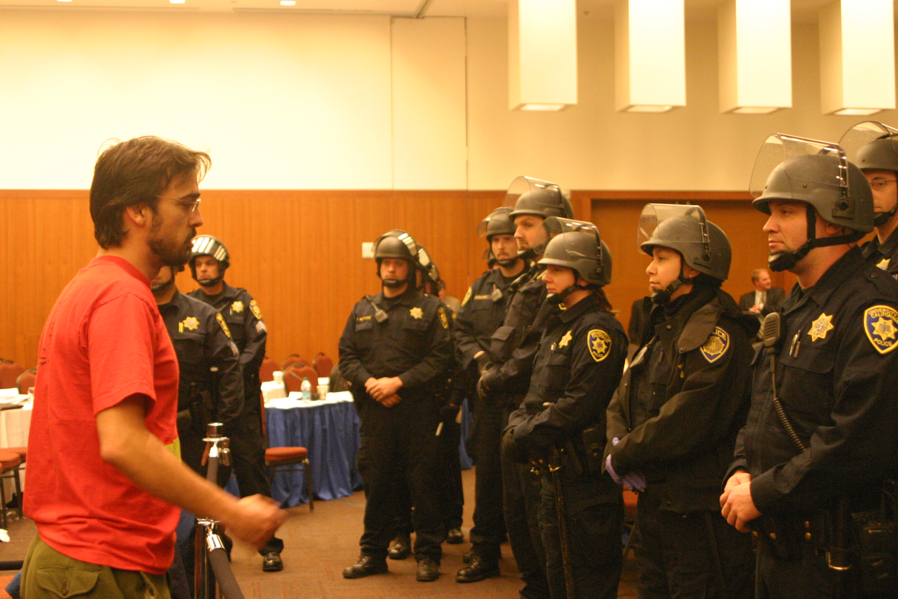 UCPD officers in full riot gear filed into the room, and Assistant Chief of Police Paul Berlin began to announce directions for discontinuing and dispersing the public assembly taking place. UC Police declared it an unlawful assembly and gave the protestors three warnings to leave the room. Though some audience members proceeded to defy directions and continue to remain in the room, others began to leave. After 20 minutes, police removed all audience members, a crowd of approximately 40 to 50 people, at the end of the last five-minute warning without incident, and began to lead them downstairs to exit the building.
