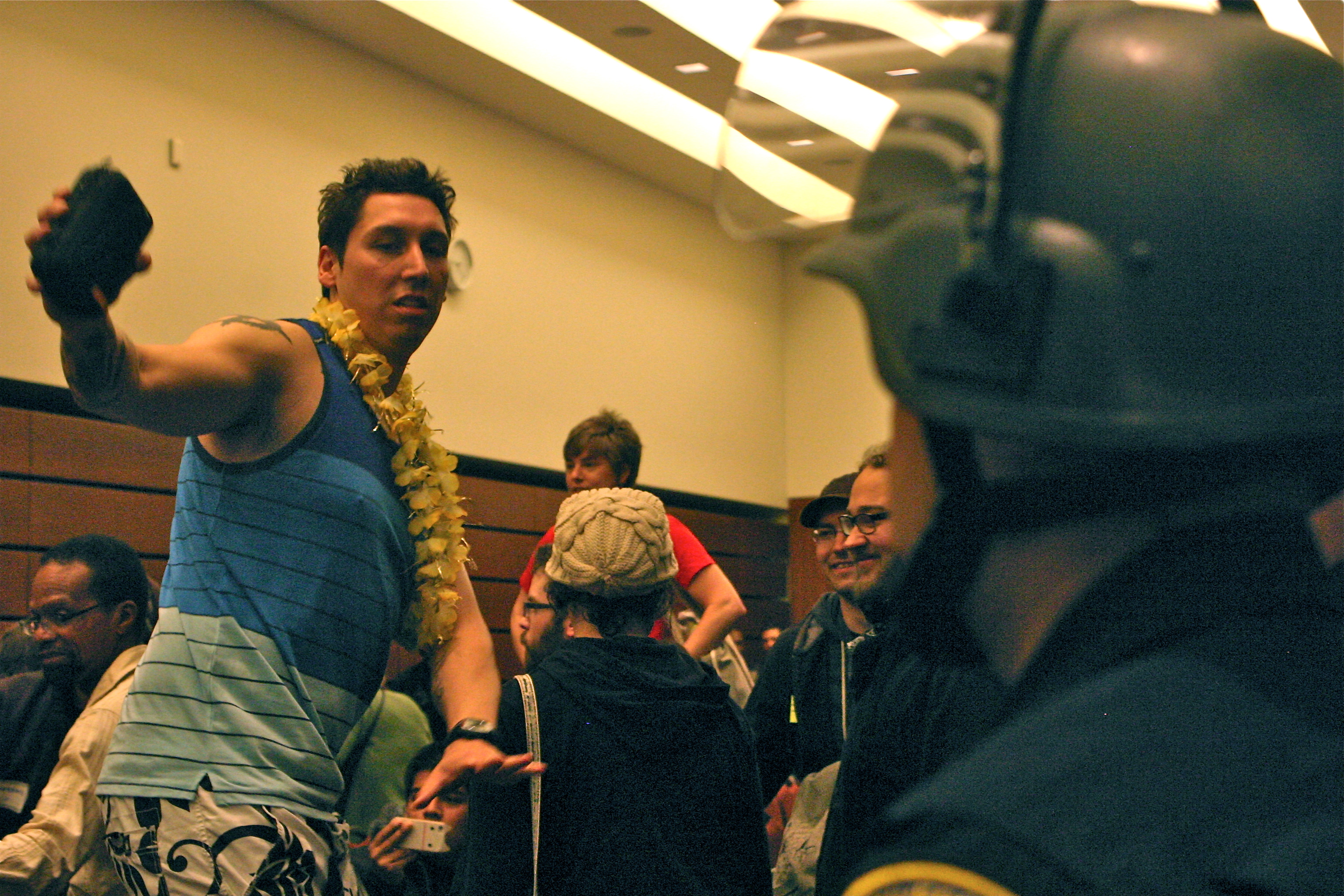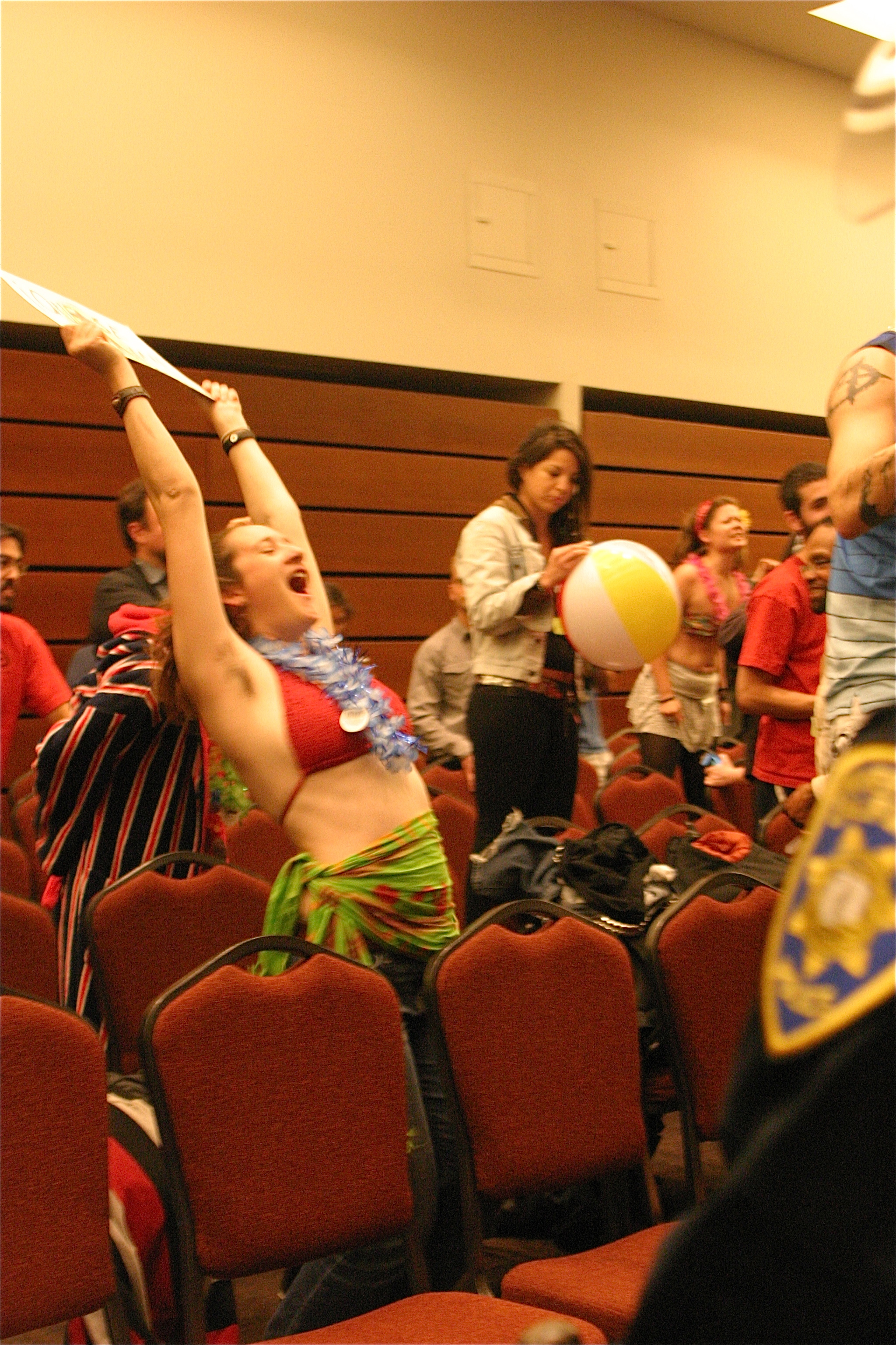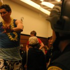 As Regents, chancellors and staff members exited the room, UC students began to dance on top of chairs in bathing suits while playing music, stating they were on spring break and should act accordingly. The “‘Rogue Element’ Spring Break Party @ UC Regents Meeting” was planned by Take Back UCLA on Facebook. Other audience members continued to shout complaints, demands and public comments to a room absent of the Board of Regents.