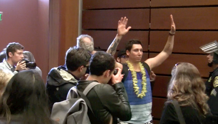 Audience members became frustrated and angry, believing the speakers list was not being maintained properly. “Mike Checks,” in which an audience member shouts a statement, which is repeated back by the crowd ensued, disrupting the UC Regents meeting. Regent Lansing issued two warnings to the audience before formally suspending the UC Regents meeting at 9:18 a.m.