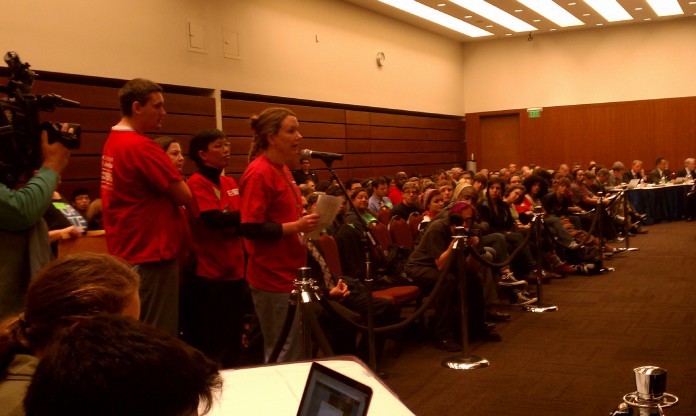 During public comment, protesters stationed themselves in the conference center courtyard and on 16th street, blocking entrance by vehicle to the meeting. Those who were unable to get on the speakers list for public comment, or who were on the list but had not been permitted to speak because of the half-hour time limit, stationed themselves in the courtyard. Many held signs demonizing the supposed privatization of UC as well as calling for a roll back in cuts and fee hikes, mirroring the previous day’s Regent support for returning student fee levels to 2009 standards.