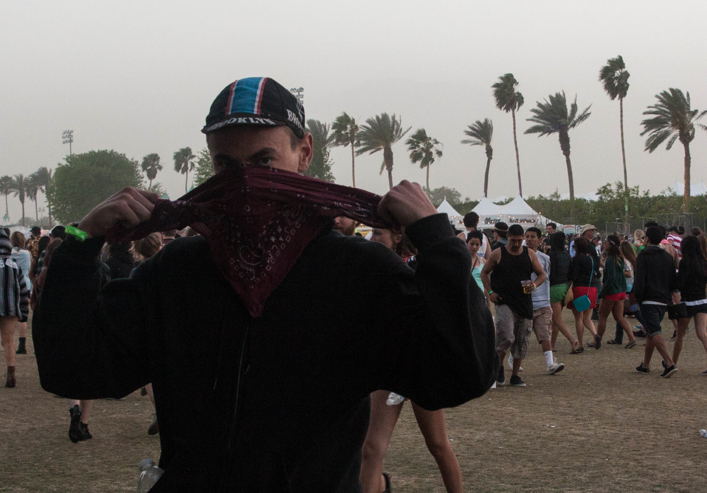 Dust storms begin to pick up, causing festival-goers to put on handkerchiefs and masks.