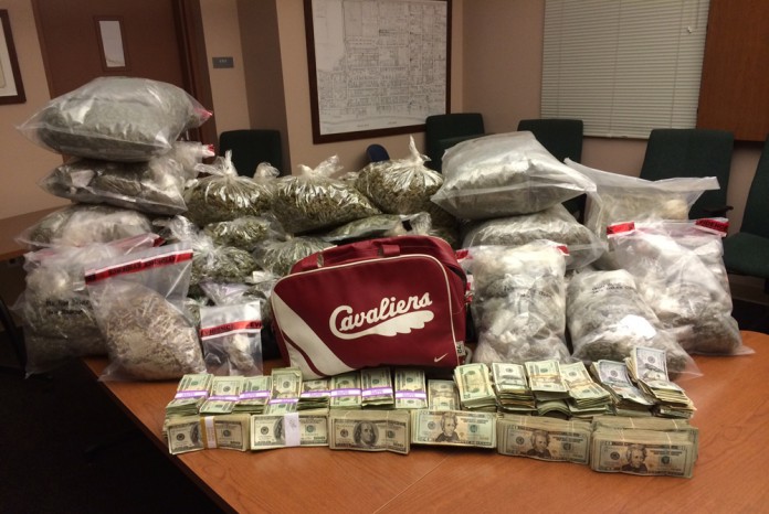 Also buried in the narcotics stockpile is a maroon Nike Cavaliers sports bag. Stacks of cash, in various denominations, front the drugs and the Cavaliers duffel. Some have currency straps denoting $2,000, $4,000 and $10,000.