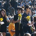 As a vast multitude of mourners moved toward the stadium, the carillon rang in the belfry of Storke Tower, providing a somber resonance for the procession. Six wreaths–for James Cheng Yuan Hong, George Chen, Weihan David Wang, Katherine Breann Cooper, Veronika Elizabeth Weiss, and Christopher Ross Michaels-Martinez–were draped under the stage in tribute to the fallen University of California, Santa Barbara students.