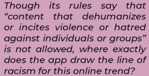 As per TikTok’s community guidelines, hate speech including slurs and bullying isn’t tolerated on the app. Though its rules say that “content that dehumanizes or incites violence or hatred against individuals or groups” is not allowed, where exactly does the app draw the line of racism for this online trend?