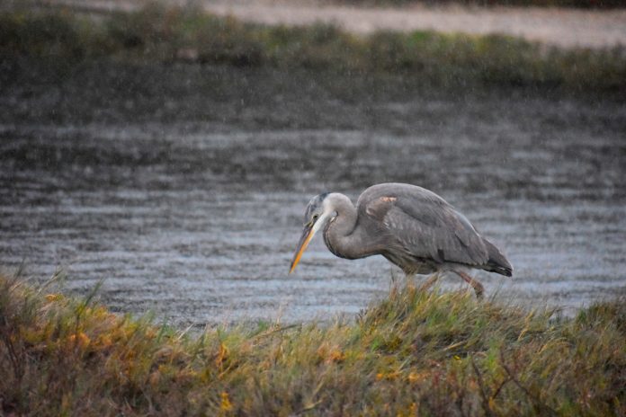 I didn’t set out to see the heron. I was walking back from class, head down against the drizzle, when I looked up and noticed it — a great blue heron, neck drawn into an elegant S, standing still at the edge of the campus lagoon. It looked like a question the weather had asked. I stopped.