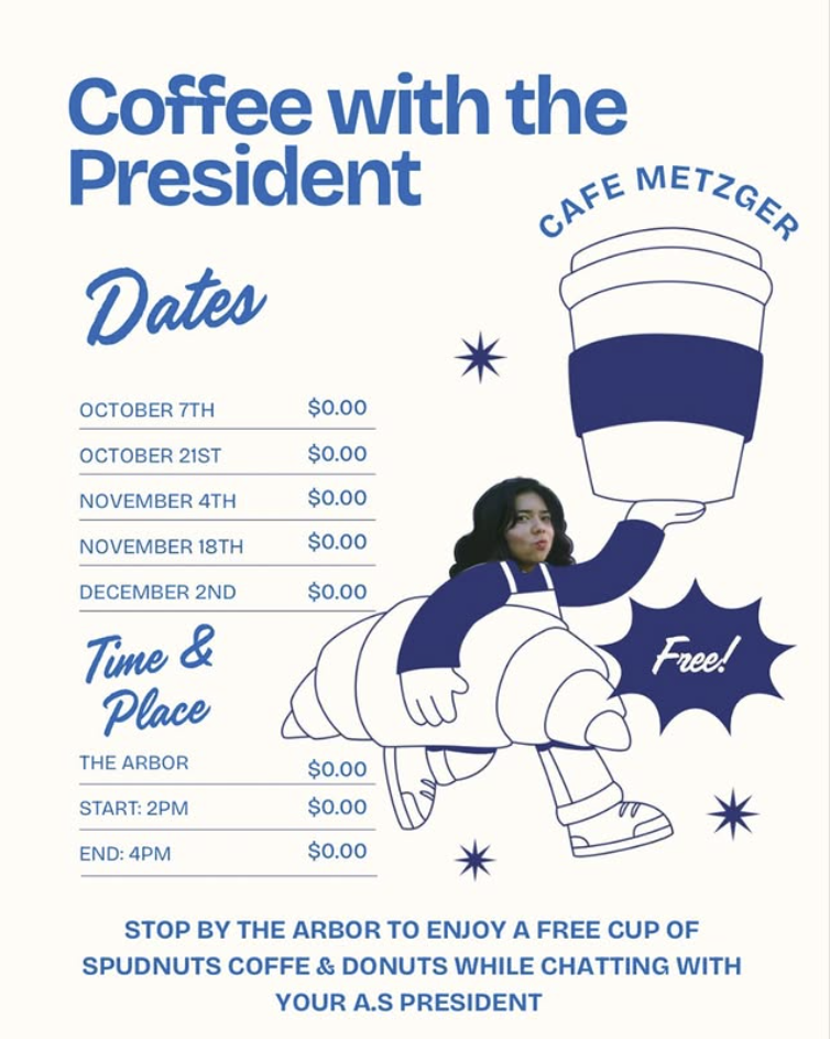 On Oct. 8 from 2–4 p.m., Associated Students (AS) President Le Anh Metzger tabled outside the Arbor for her first Coffee with the President. With Spudnuts coffee and donuts provided, students stopped by with a range of questions from student government to general advice.